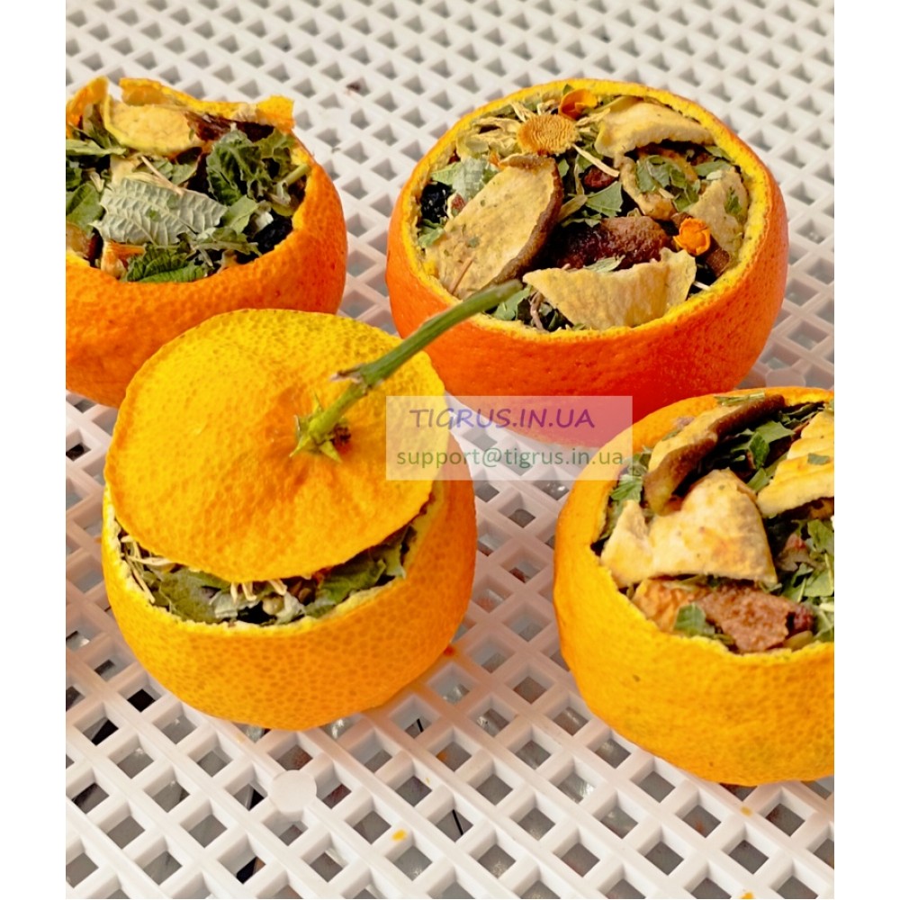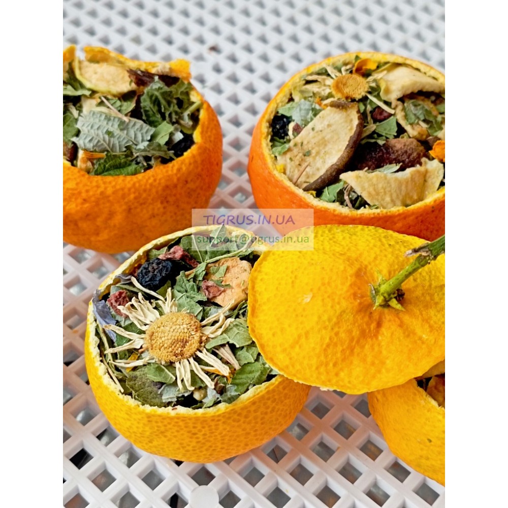 Чай у мандарині - це не просто напій, а маленький ритуал затишку й тепла. Кожен сушений мандарин ми готуємо вручну: дбайливо очищаємо, наповнюємо натуральними травами та висушуємо при низьких температурах, щоб зберегти аромат і користь природи.